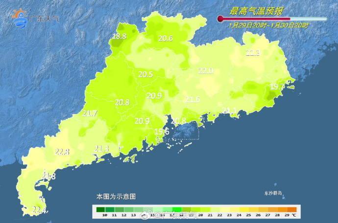 广东省神志台瞻望,1月30日-2月1日,冷高压东移削弱,广东大部气温回升,旦夕有(轻)雾,间中有小雨。
